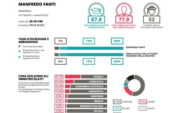 MODENA – Qual è la scuola superiore ideale? La risposta è ovvia: dipende. E come ogni anno, il percorso guidato su Eduscopio.it permette di orientarsi un po’ più facilmente. Una volta inseriti i dati generali dell’utente – che può essere uno studente di scuola media, un genitore o anche un insegnante – si indicano l’indirizzo generale, università o ingresso immediato nel mondo del lavoro, e i riferimenti geografici, comune baricentro e raggio in chilometri da dieci a trenta. Ed eccole qua: le classifiche, indirizzo per indirizzo. Partiamo dai licei: sul classico l’Allegretti di Vignola ottiene l’indice composito più alto, fatto di voto medio di maturità e tasso di abbandono; poi il Formiggini di Sassuolo, il Muratori San Carlo, infine il Sacro Cuore. Tra gli scientifici domina il Fanti di Carpi, miglior coefficiente dell’intera provincia in assoluto, primo pure per l’indirizzo scienze applicate. Sempre bene il Formiggini, seguono Tassoni, Corni e Wiligelmo. Curiosità: mentre sull’indirizzo classico e su quello umanistico – vedi Sigonio – una fetta importante di studenti va verso le università di Bologna e Parma, in ambito scientifico il plotone di diplomati converge quasi tutto su UNIMORE, con qualche fuga verso il Politecnico di Milano. Nell’indirizzo tecnico con sbocco universitario i migliori sono il Paradisi di Vignola in ambito economico e l’inossidabile Fermi su quello tecnologico, seguito da Selmi, Guarini e Spallanzani. Per chi invece vorrebbe un lavoro subito dopo il diploma i parametri cambiano: sono due, percentuale d’impiego e pertinenza dell’impiego trovato rispetto al piano di studi. Il Barozzi, ad esempio, in ambito economico offre una chance di tempo indeterminato del 60%, ma con una pertinenza bassissima – 22,9. Il Ferrari di Maranello in ambito industriale è praticamente un binario, anzi un circuito: due studenti su tre trovano posto a tempo indeterminato, e tre su quattro esattamente nell’ambito di studi. In questa classifica spiccano lo Spallanzani di Castelfranco, il Volta di Sassuolo, lo Spallanzani e il Cattaneo nell’ambito servizi.
